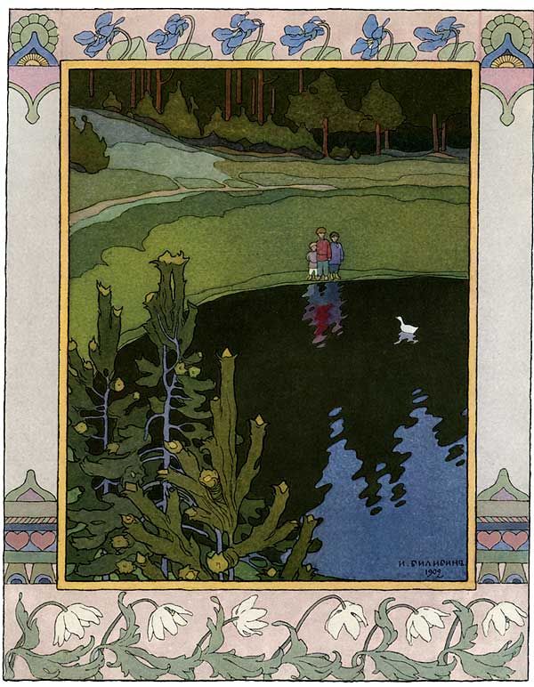 А белая уточка нанесла яичек, и из тех яичек народились мальчики, два крепких, здоровеньких, а третий не удался - хил да слаб, совсем заморышек. Она их вырастила, стали они по реченьке ходить, злату рыбку ловить, лоскутики сбирать, кафтаники сшивать, да выскакивать на бережок, да поглядывать на лужок.