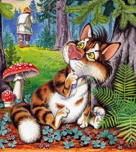 Кот ходил, ходил и набрёл на избушку; залез на чердак и полёживает себе. А захочет есть - пойдёт по лесу птичек да мышей ловить, наестся досыта и опять на чердак, и горя ему мало!