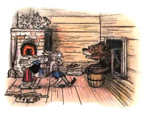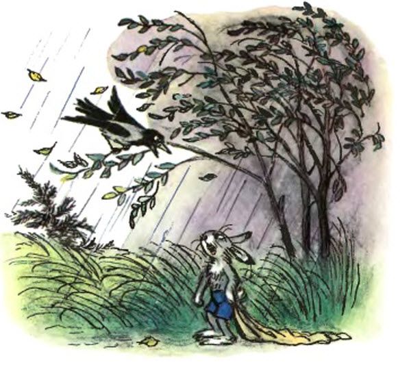 Зайчиха подбежала к двери: на пороге стоял Заяц, весь мокрый.