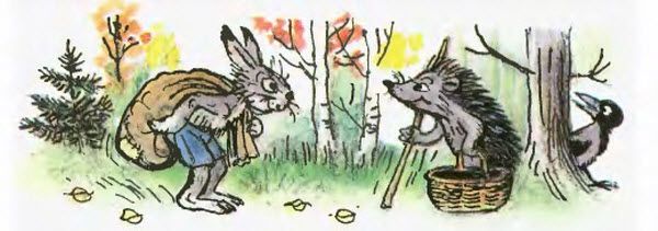 Попрощался Еж, ушёл, а корзину с грибами оставил Зайчихе.