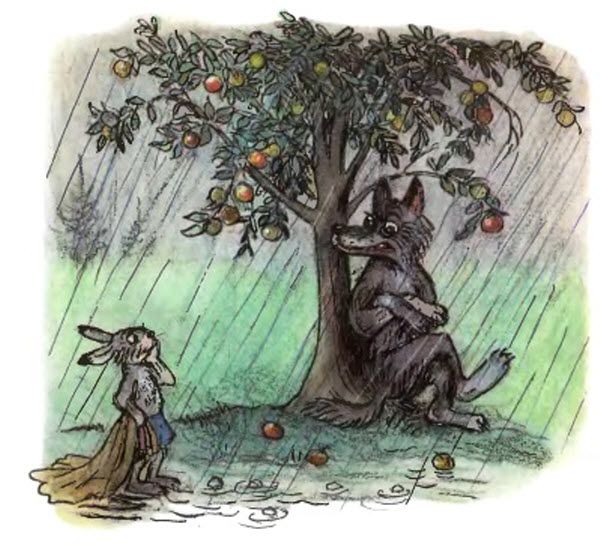 И вдруг посреди зелёной поляны увидел он дикую яблоню. А яблок румяных на ней и под ней — видимо-невидимо! Недолго думая раскрыл Заяц свой мешок и стал в него яблоки собирать.